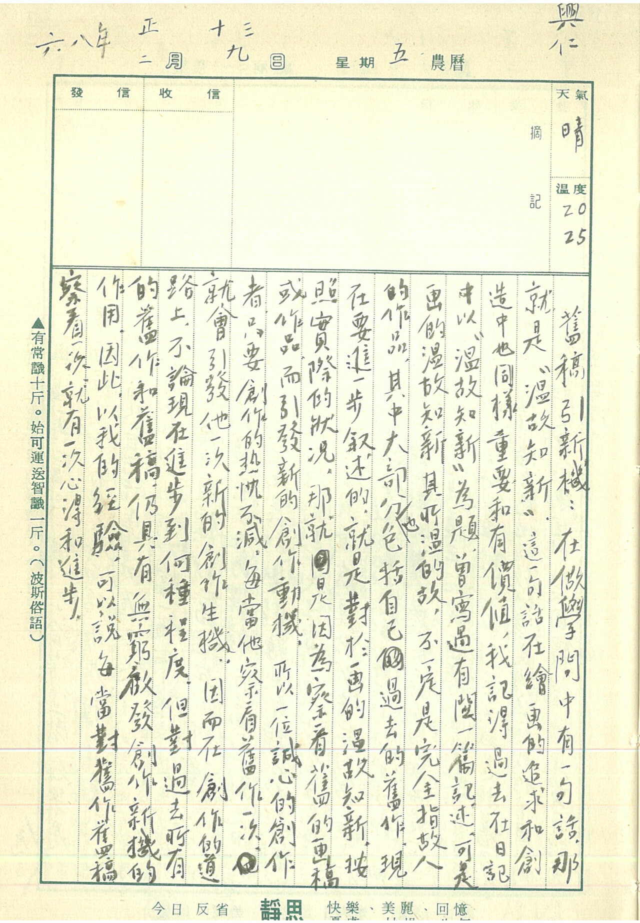 在做學問中有句一話,那就是「溫故知新」,這一句話在繪畫的追求和創造中也同樣重要和有價值,我記得過去在日記中以「溫故知新」為題,曾寫過有關一篇記述,可是畫的溫故知新,其所溫的故,不一定是完全指故人的作品,其中大部分也包括自己過去的舊作,現在要進一步敘述的就是對於畫的溫故知新,按照實際的狀況,那就是因為察看舊的畫稿或作品而引發新的創作動機,所以一位誠心的創作者只要創作的熱忱不減,每當他察看舊作一次,就會引發他一次新的創作生機,因而在創作的道路上,不論現在進步到何種程度,但對過去所有的舊作和舊稿,仍具有無窮啟發創作新機的作用,因此,以我的經驗,可以說每當對舊作舊稿察看一次,就有一次心得和進步。